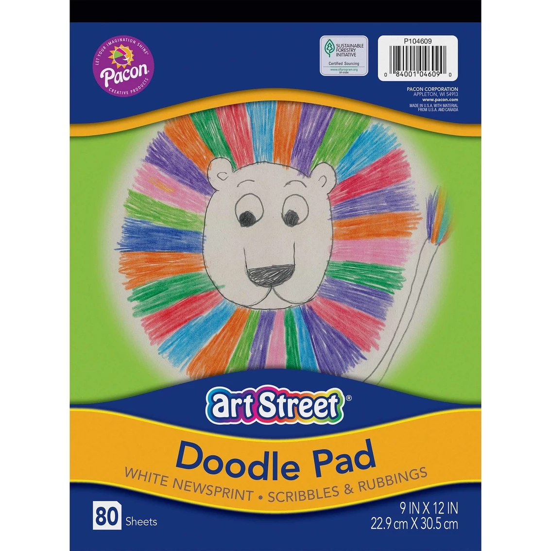 The Pacon 9 x 12 in. Doodle Pad is great for doodling, coloring or drawing with dry media. The versatile white newsprint pad is ideal for young children. It’s recyclable and comes with 80 sheets. Model: 104609.