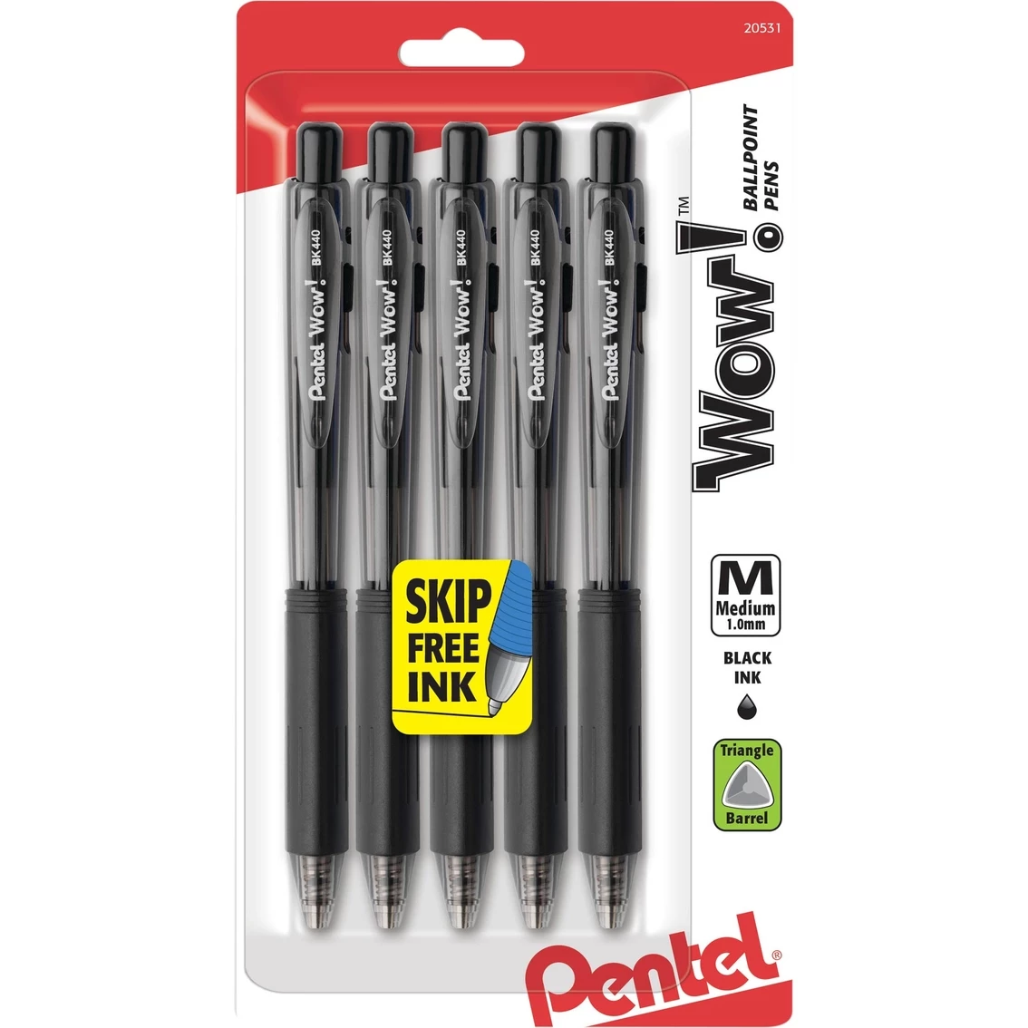 The Pentel Wow! retractable ballpoint pen offers a distinctive design that stands out in a crowd. Low in price, yet high in quality, let these pens “Wow!” you. Triangular barrel. Latex-free grip. Medium tip. Retractable tip.