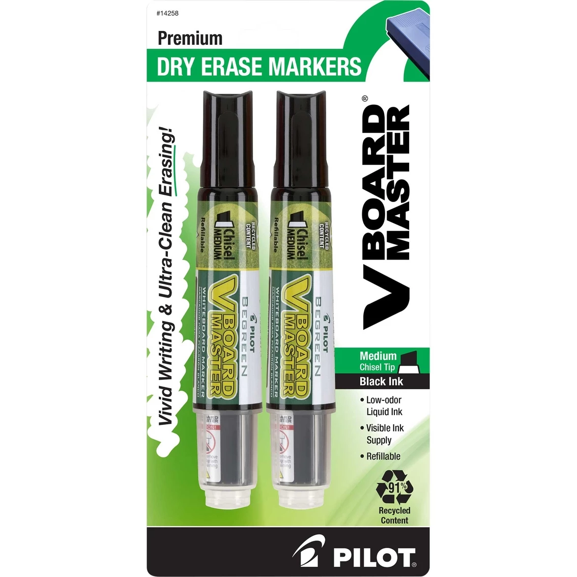 Pilot Dry Erase V Board Master Markers are vivid, with dense writing. They erase cleanly with no ghosting. Visible long-lasting ink supply. Refillable ink. Model: 14258.