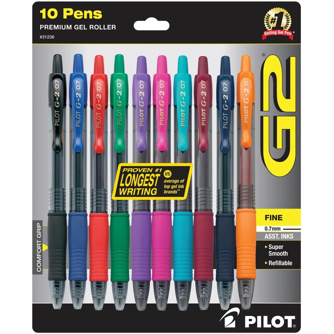 Pilot Pen G2 Gel Pens offer super-smooth writing. Their America’s #1 selling gel ink pen and longest writing gel ink pens. These pens have a fine 0.7mm point and comfortable rubber grip. Model: 31236.
