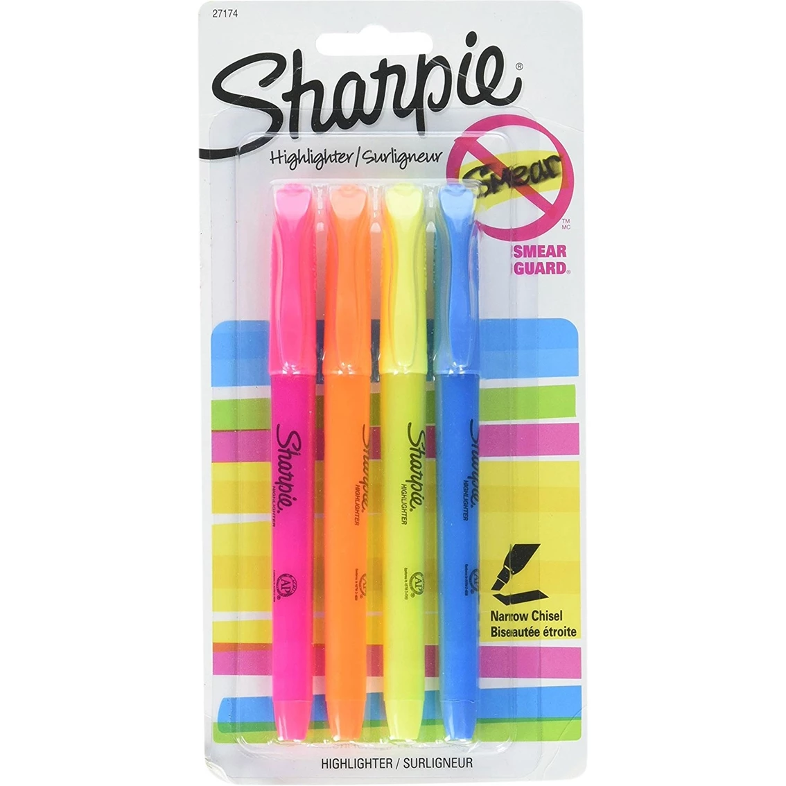 The Sharpie Accent Pocket Highlighter features Smear Guard Ink technology which has been specially formulated to resist smearing of many pen and marker inks. The versatile chisel tip is great for highlighting or underlining. This highlighter offers the dependability and quality you can trust from Sharpie. Assorted Colors. Includes four highlighters. Model: 27174.