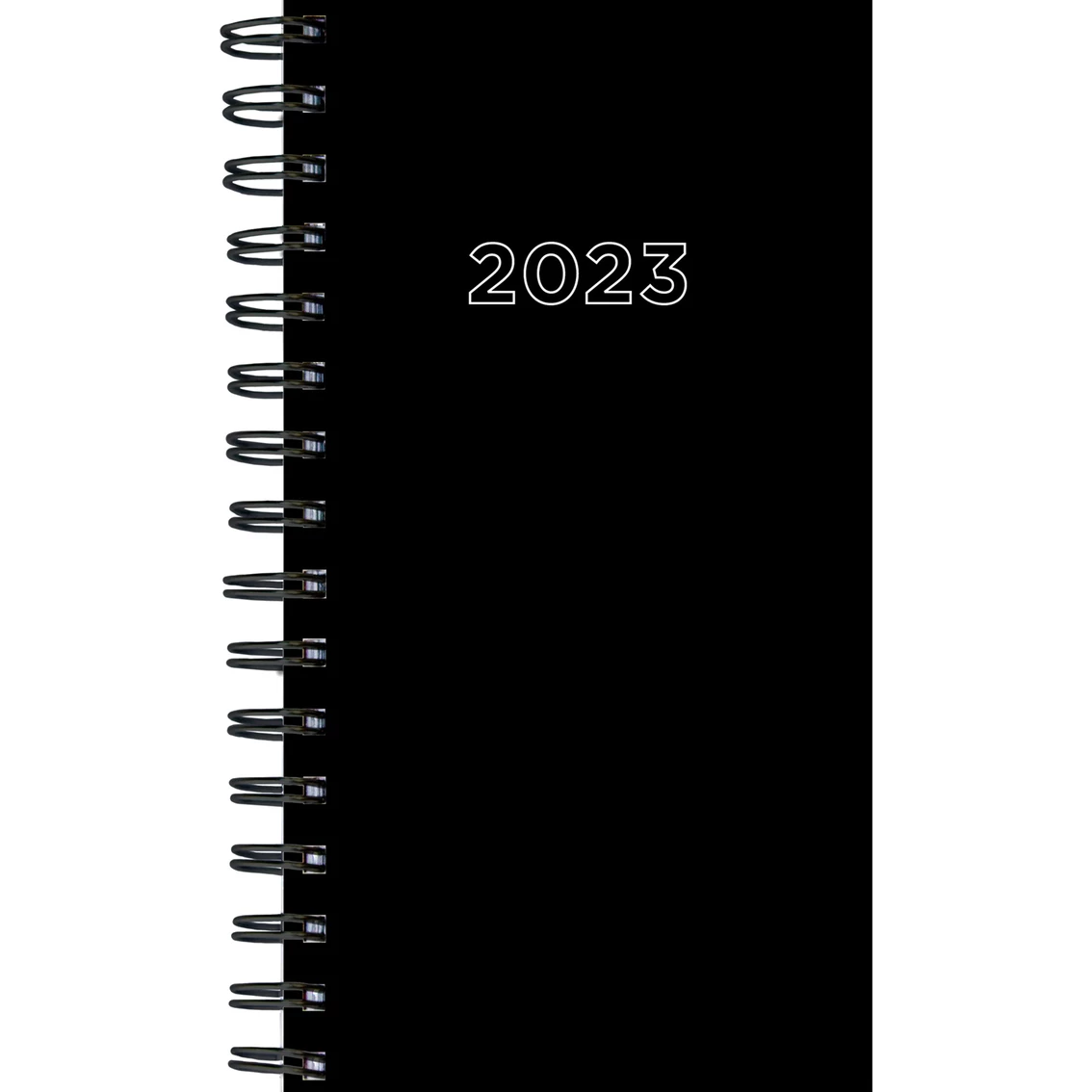 Keep your mind clear and your schedule organized with this straightforward 12 month 2023 planner in basic black! Compact but rugged enough to fit in a pocket, handbag or backpack, the small weekly/monthly planner measures 3.5 in. W x 6.5 in. H and features monthly 2-page calendar grids for ample planning space. Weekly planning pages offer open spaces for detailed, daily plans and faux tabs for quick reference. The durable and textured cover has black wire-o binding to lay flat when open with a bonus glance at page for years 2023 and 2024 in the front and notes pages in the back. Spanning the months of January 2023 to December 2023, this product contains no plastic — goods without guilt!