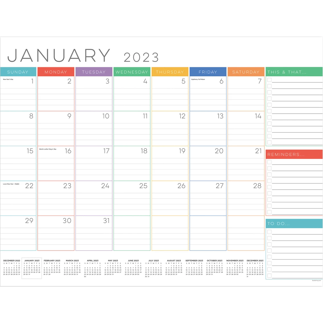 Keep it simple! Straightforward without the fluff, this clean, yet sophisticated design makes this 12-month desk pad calendar from TF Publishing perfect for your office space or kitchen counter. The color-popping palette jumps off the Kraft-color paper, making this an eye-catching way to plan your year. The monthly tear-off pages boast extra-large, lined monthly grids with multiple sections for notes and checklists and an overview of the entire year. Spanning January 2023 through December 2023, this calendar is printed on high quality, thick paper, allowing for smooth writing and easy erasing. Measuring 22 in. W x 17 in. H, the desk calendar has a horizontal orientation and can either lay flat on a desk or be hung on the wall with the drilled holes. It comes packaged in a poly bag and includes corner protectors. Model: LBL-23-8212.