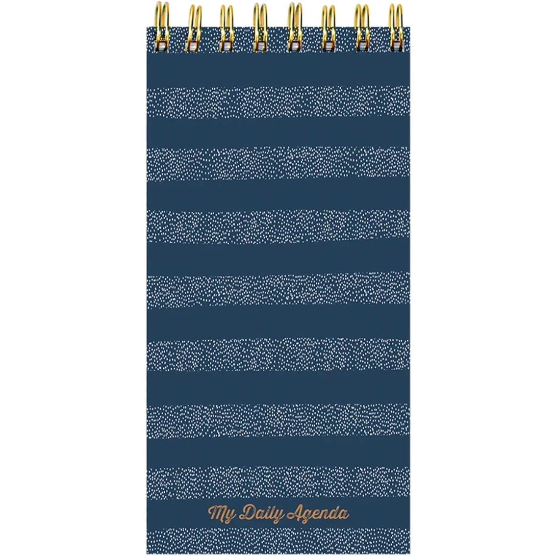 TF Publishing Undated Blue Boho Stripe Daily Agenda Notepad Planner. Navy and light blue stripes give this daily agenda a professional look but is still full of personality. Conveniently sized at 4 x 8.5 in., it is perfect for any on-the-go lifestyle! With this open-dated format, you can choose how structured your plans will be for a particular day. Each of the lined 130 perpetual sheets have a place to circle which day of the week it is, a place for the day’s date and is segmented into three sections for Morning plans, Afternoon plans and Etc. for those extra daily reminders. Planner has wire-o binding easily allowing it to lay flat and a convenient flip between pages as well as hard, durable front and back covers. Secured with an elastic band. Model: 99-5720.