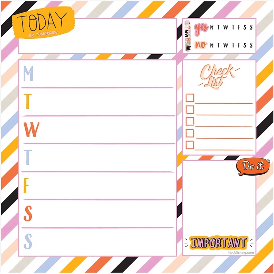 TF Publishing Undated Super Stripe Weekly Square Schedule Pad/ Staying organized is a snap with this fun and funky 7.75 x 7.75 in. weekly, open dated memo mouse pad. Jot down your weekly schedule on the daily, weekly segments and your daily notes, then tear it off and start anew the next week. The desk pad is perfect for your desk, kitchen counter and can also double as a mouse pad. The pad has 52 tear-off, perpetual, weekly sheets for you to track all your appointments and to dos. Comes packaged in shrink wrap. Model: 99-5942.