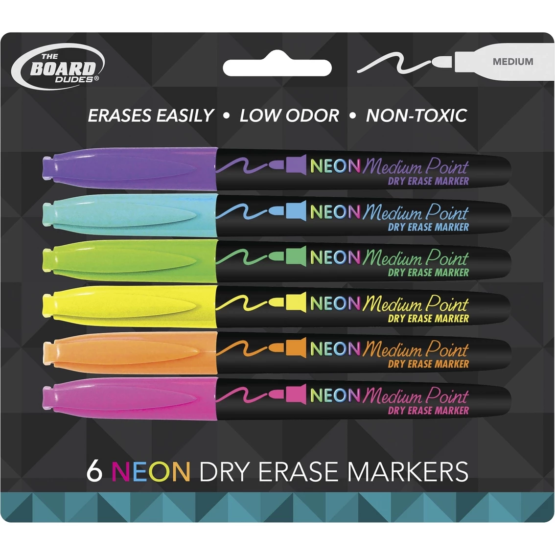 This 6 pack of medium point neon dry erase markers erases cleanly on any dry erase surface. The medium point tip allows for detailed work on a large surface. Available in 6 bold, neon colors for all your writing and drawing needs.