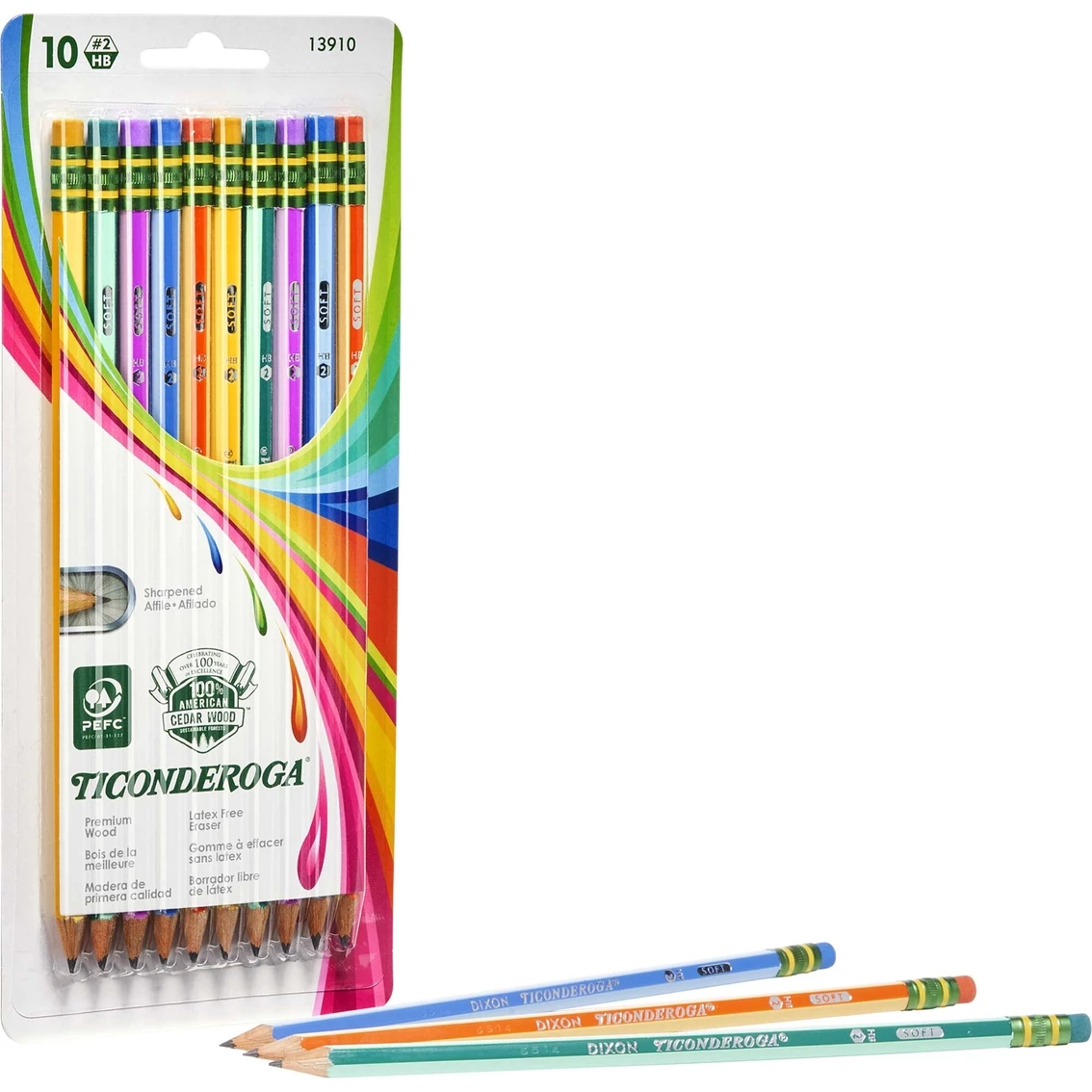 Teachers prefer Ticonderoga for its dependability and craftmanship. They have a tradition of fine quality writing instruments in the US for over 100 years. The exclusive graphite core of these No. 2 pencils features a proprietary formula focusing on graphite mined from carefully controlled sources to deliver extra smooth performance. Top-quality, latex-free erasers remove marks completely without smudging and premium wood harvested from responsibly managed sources; providing a smooth and even sharp experience with minimal breakage. When only the best will do, choose Ticonderoga brand pencils. Style: 13910.